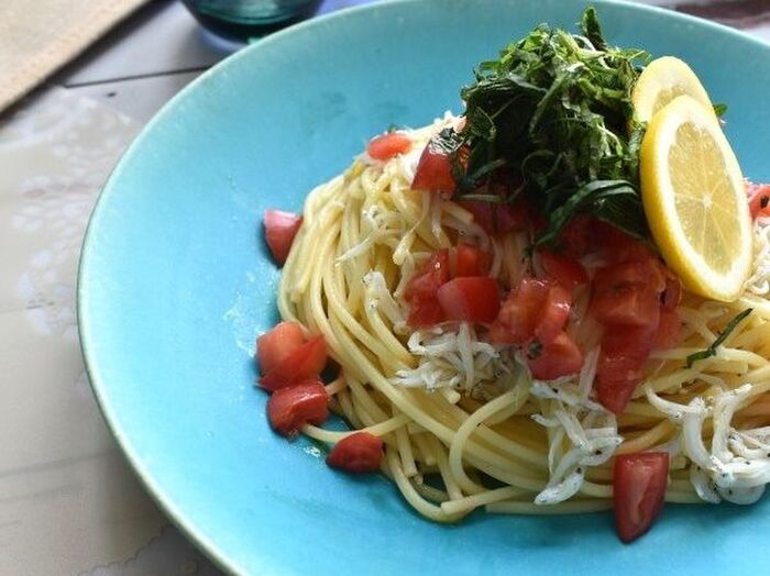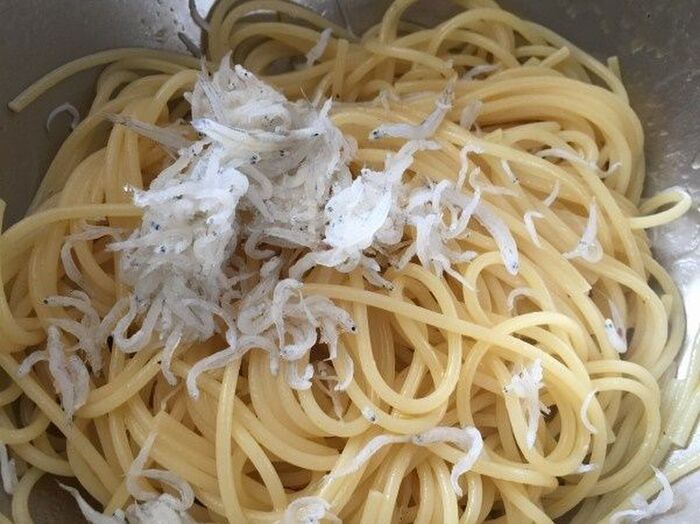 茹でたパスタを加え全体に絡めたらシラスを入れふんわり混ぜ合わせる