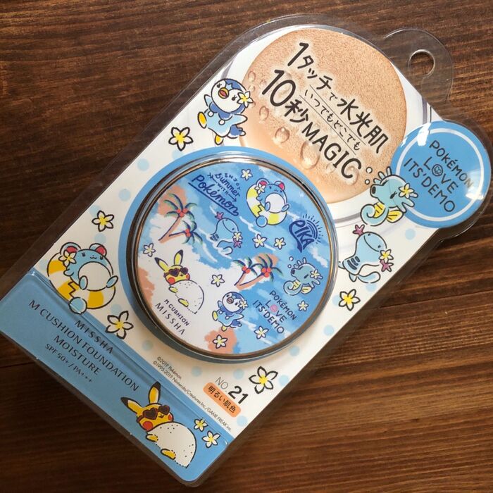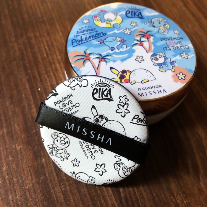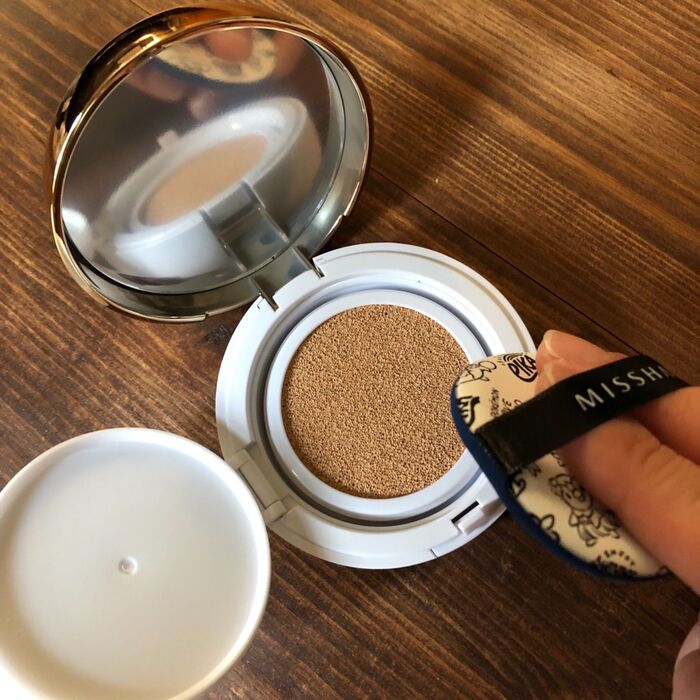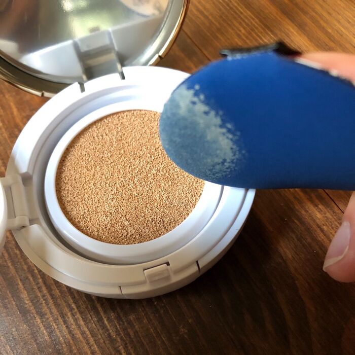 パフの裏は青色。パフに適量をとり、肌にポンポンするだけで、ベースメイクができます!
