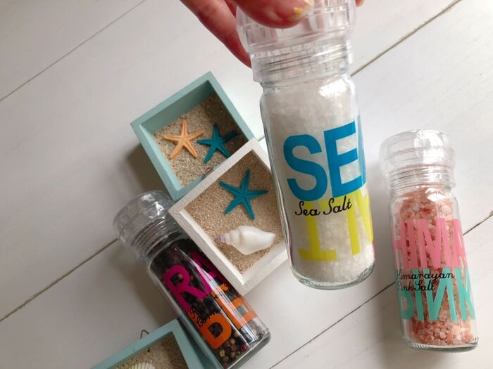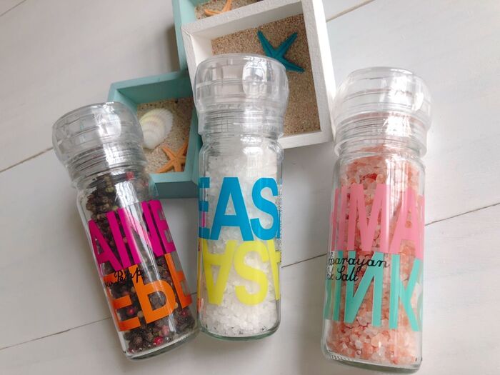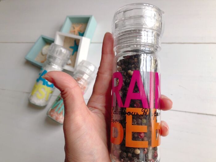 ヒマヤラピンクソルト(岩塩)シーソルト(海塩)2種類の塩とレインボーペッパーを購入♡ピンクソルトを買いに行ったのですがボトルがあまりにも可愛いので見映えする使ってみたい3本をチョイス♡ハーブ入りのイタリアンなソルトや種類の違うペッパーもありましたよ♡