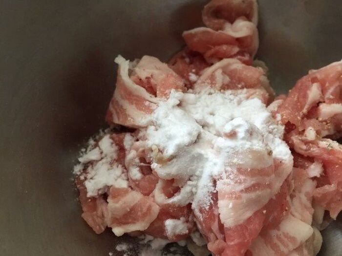 豚バラ肉は食べやすい大きさに切り 塩・コショウして片栗粉をまぶす