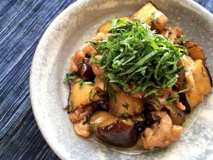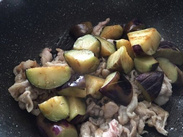 同じフライパンで豚バラ肉を炒め 色が変わったらなすをもどす
