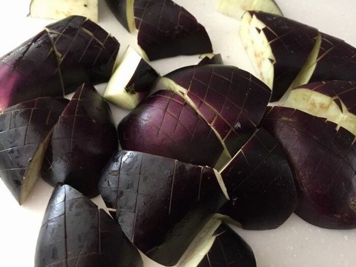 なすは縦半分に切り 縦横に切り込みを入れたら乱切りにする