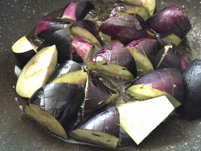 フライパンにオイルを入れ なすを焼き いったん取り出す