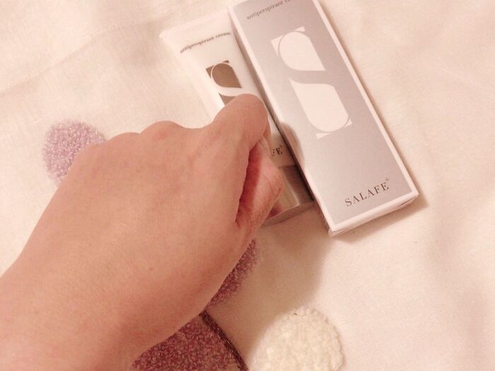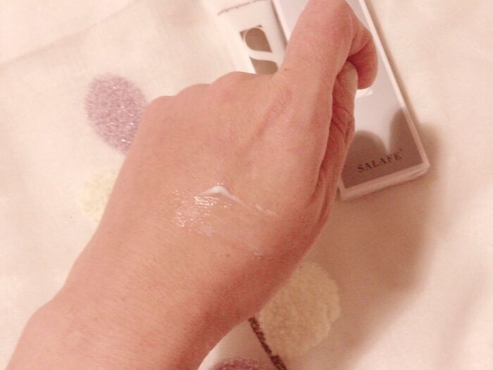 洗顔後、水気をしっかり拭き取った後に化粧水でパッティングしてから『サラフェプラス』を一円玉大手に取ってムラにならないように丁寧に伸ばします。