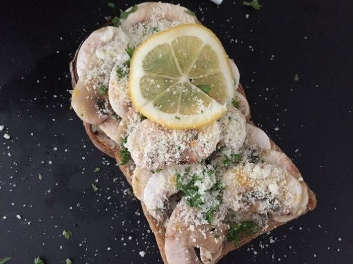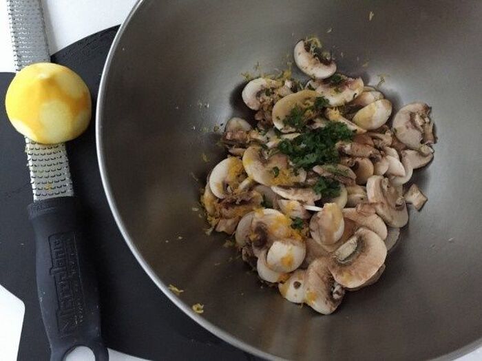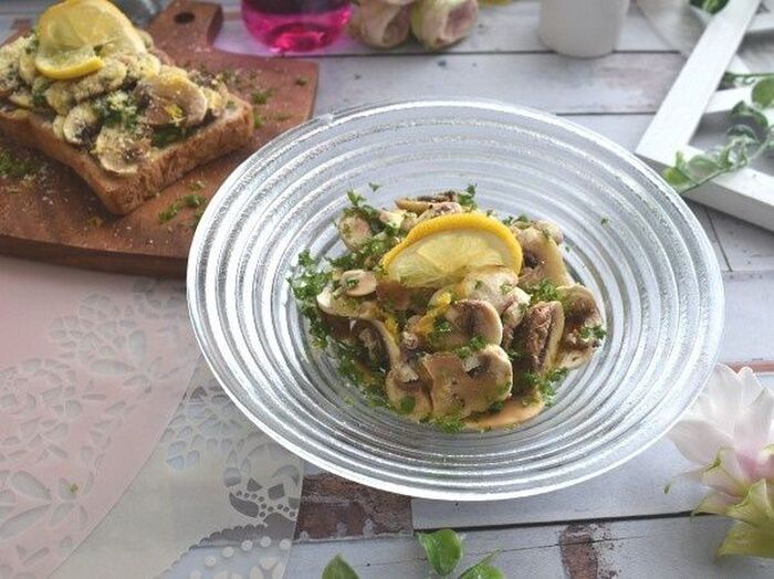 マッシュルームをたっぷりのせ パルミジャーノをふり レモンの輪切りをのせ