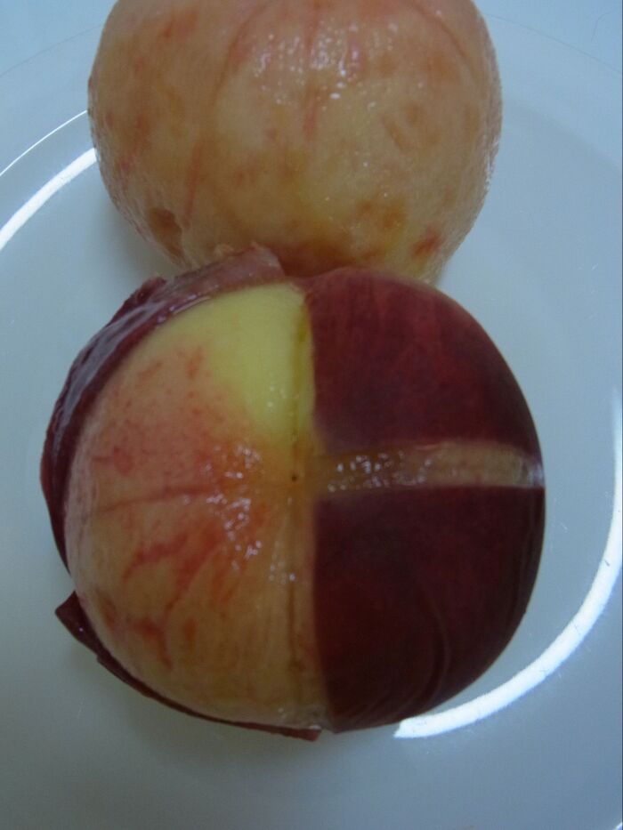 桃に十字の切れ目を入れて 沸騰したお湯に入れ30秒位、切れ目が少し開いたら冷水に浸けます。
