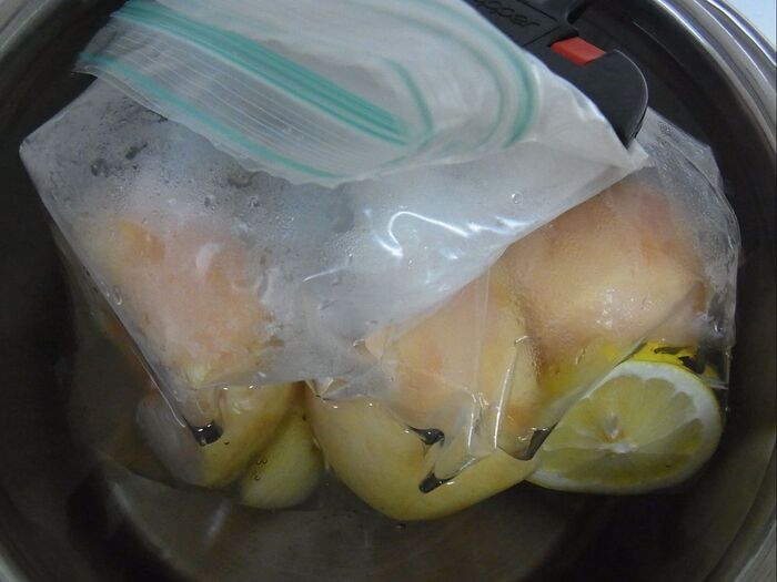 ※「写真説明」シロップが流れないように、鍋から保存袋の端が出ないようにクリップで止めています。