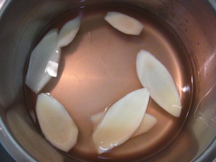 大きめの鍋で湯を沸かし、浸けて煮ていきます。