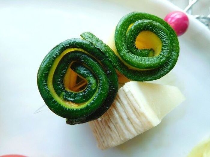 ズッキーニを縦に薄く切り、グリルパンで焼いてくるくる巻いて