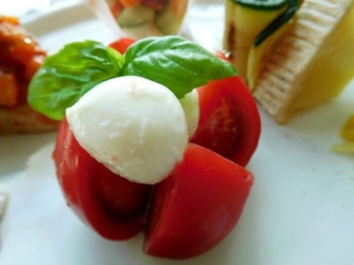 小さめのトマトに十字に切り込みを入れ、モッツァレッラを2個詰めて