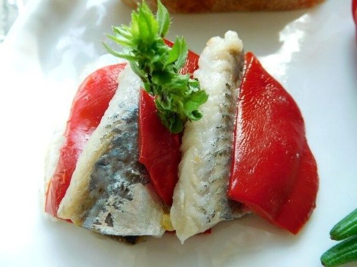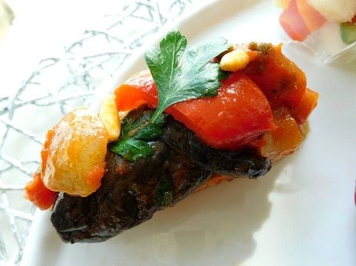 パプリカはオーブンで焼いてから皮をむいてつけています。