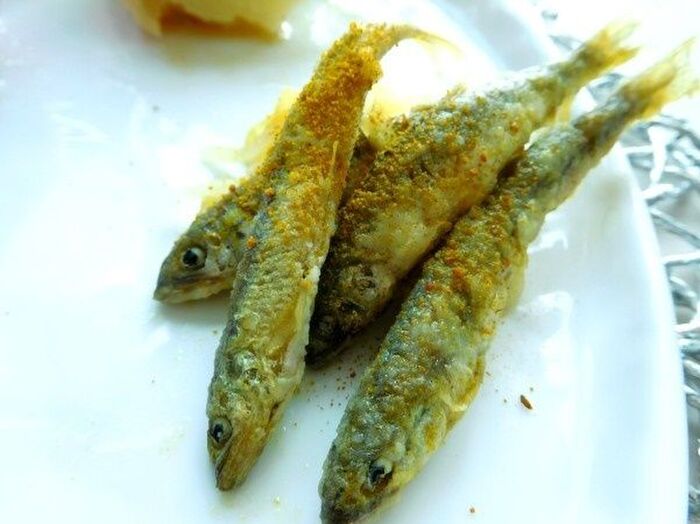 稚鮎に小麦粉を薄くまぶして揚げ、カレー塩をまぶしました。