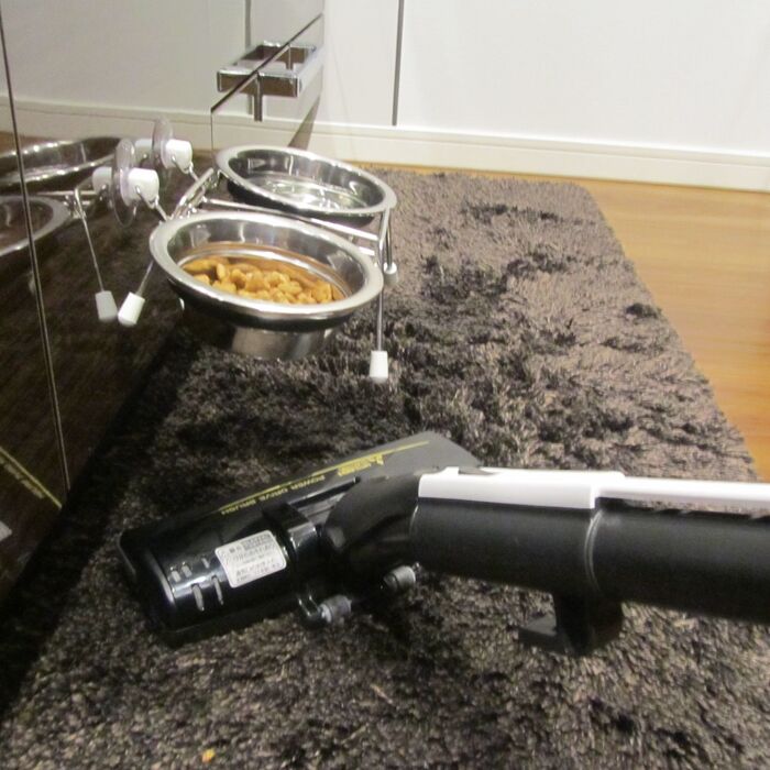 キッチン側にフードのお皿が寄せられて人が歩きやすくなり、うっかり足が当たってしまうということがなくなりました。