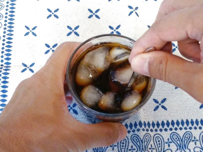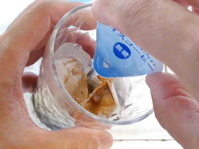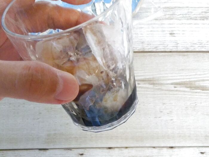 コーヒーフレッシュのようにコップに注いで、水を150cc程度入れて混ぜるだけで簡単にアイスコーヒーが完成しますよ♪
