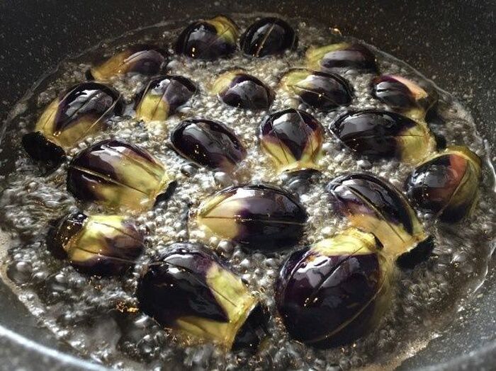 フライパンに揚げ油を入れ小ナスを素揚げする