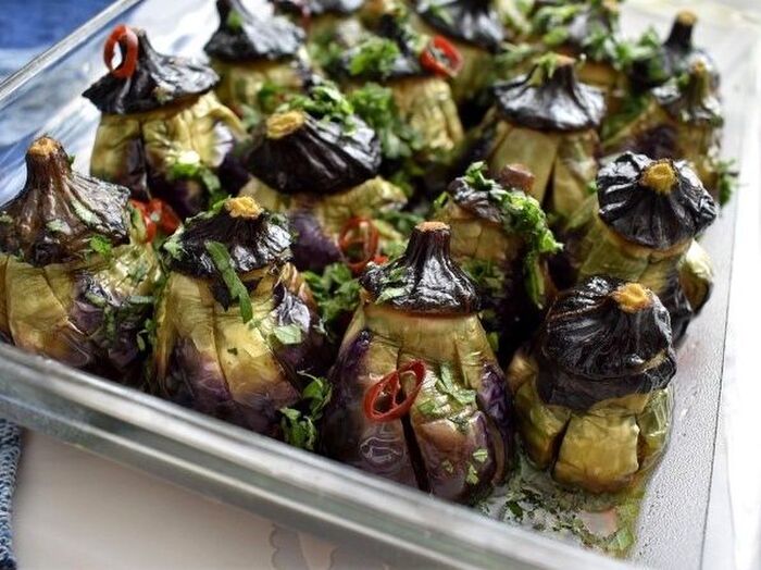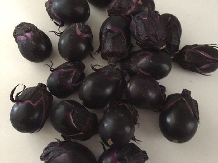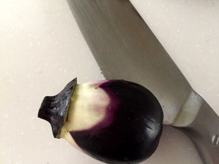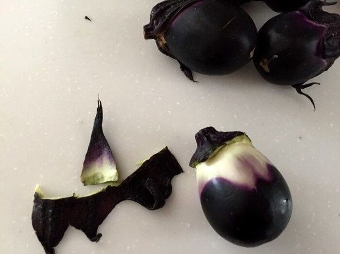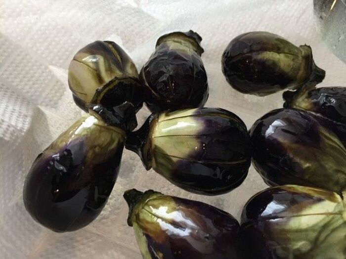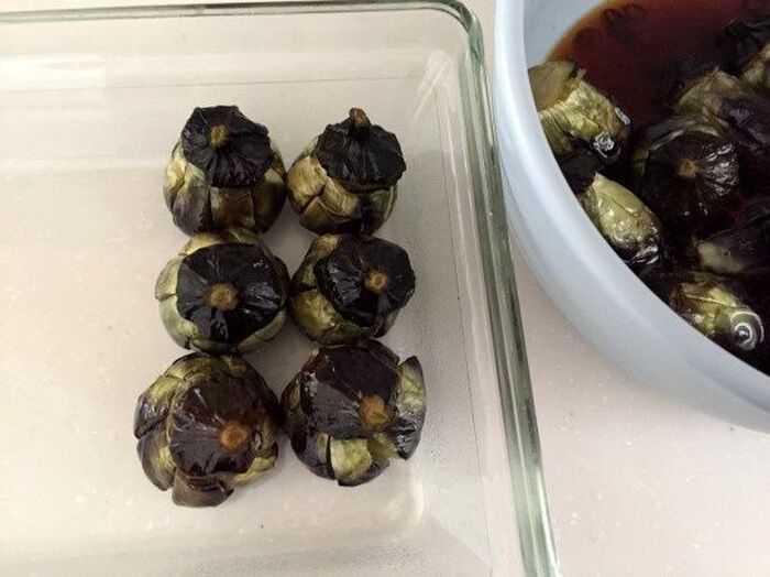 小ナスの実の部分に 深く切り込みを7か所ぐらい入れる