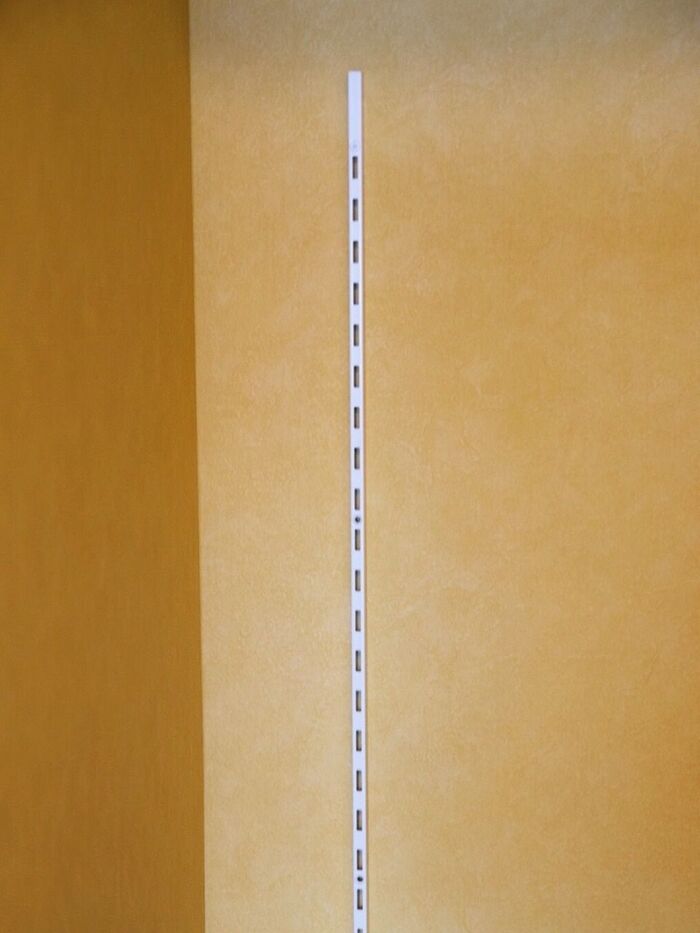 ガチャ柱と呼んだり、ダボレールと呼ばれるこの棚の位置が可動できるサポート柱を、ビスで固定していきます。今回は下地があるので直打ちですが、クロスボードの場合はクロスボードアンカーをあらかじめ打ってからその部分にビスを打ちこみます。