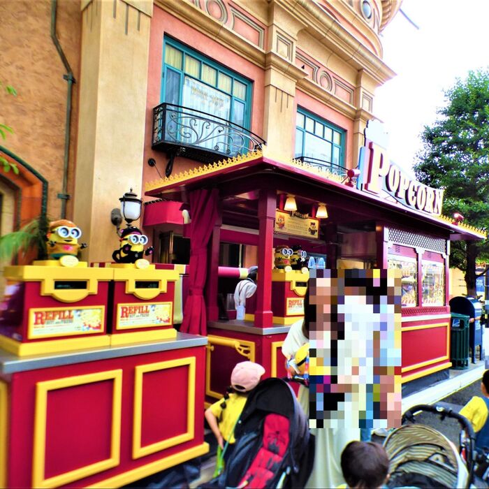 入場ゲートくぐり、写真左手に見えるポップコーンカートで”アイ・ラブ・ティム”ポップコーンバケツ販売されています。