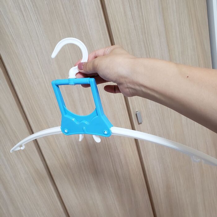 閉じている状態で服の袖にハンガーを片方ずつ通し、カチッというまで広げるとこんな感じになります。