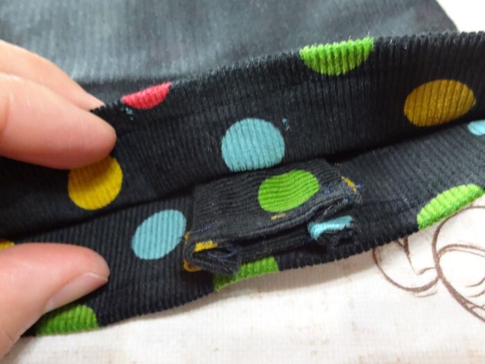 ①の上部分は紐を通すので、少し縫い代を織り込んでまちばりで固定する。