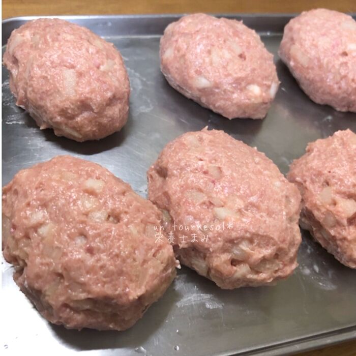 玉ねぎとしょうが・卵・マヨネーズ・塩・胡椒をいれよく混ぜ合わせたら、7〜8等分にしてまとめる。
