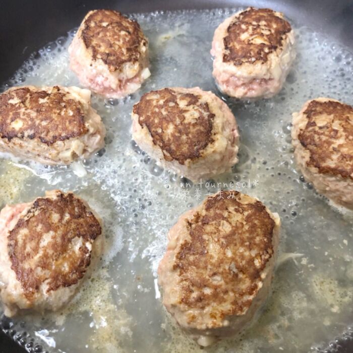 フライパンに③を入れて焼き目をつけたらひっくり返し、水を入れてフタをして蒸し焼きにする。《中火〜弱火》