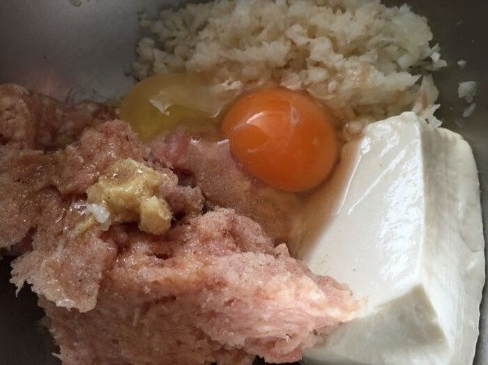 ボウルに鶏ひき肉とみじん切りにしたレンコンと玉ねぎ 水気を切った豆腐