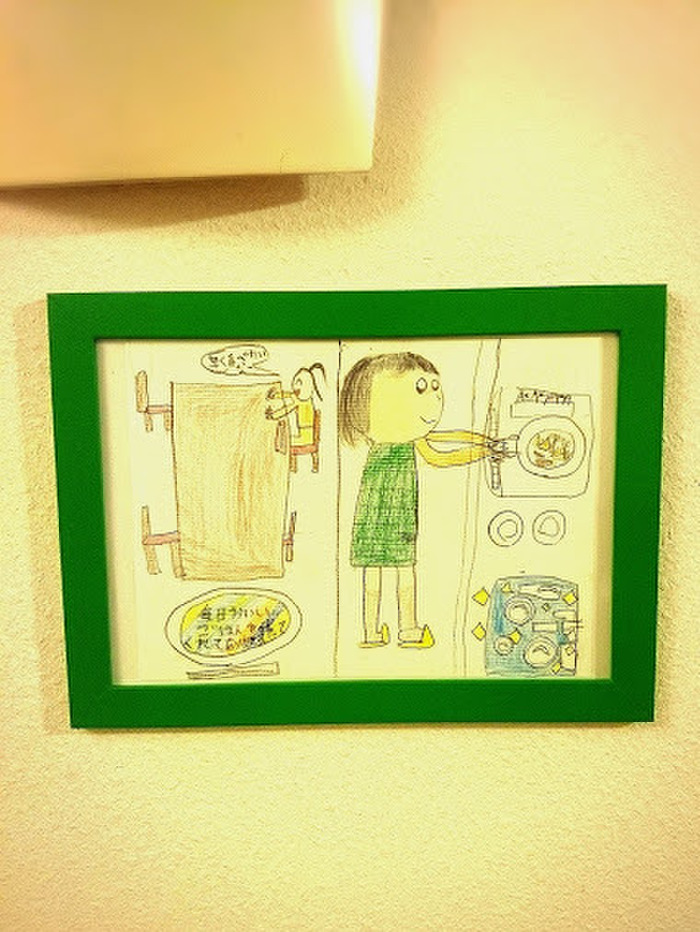この画用紙サイズのフレームは、2ヶ所とめ具がついていて、とっても軽いので画鋲ひとつで飾れます。