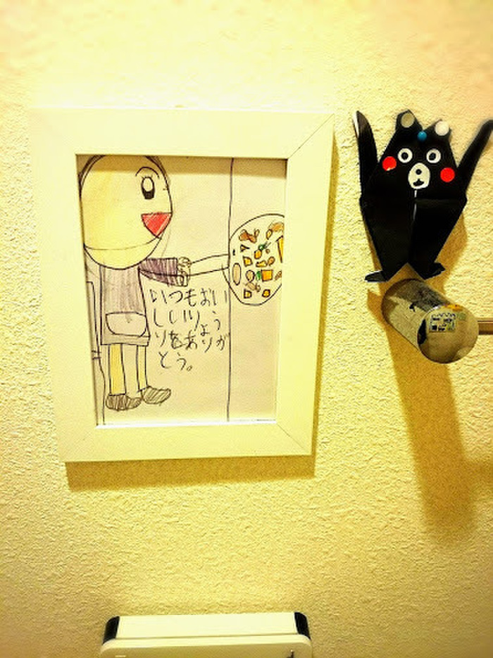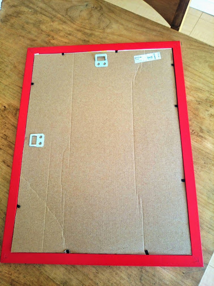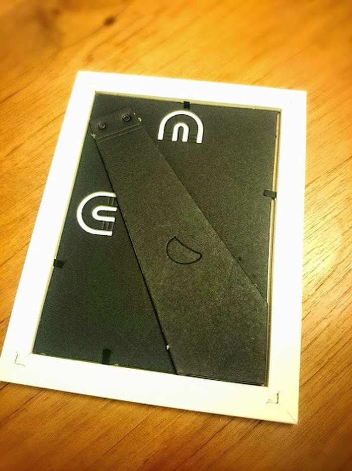 フレームに入れなければ、画鋲の穴が4つ開いてしまうけれど、IKEAのフレームに入れると、穴は1つ開くだけで、ぐぐっとかわいくなりますよ。