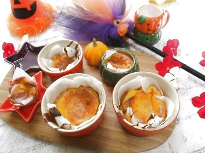ステップ③:ココットや耐熱の器に、オーブンシートをカットして敷き込み、③を器の半分位の量、加え200℃に予熱したオーブンで35分ほどを、目安に焼きます、粗熱をとり、器まま、又は、オーブンシートごと取り出し、冷凍庫で冷やします