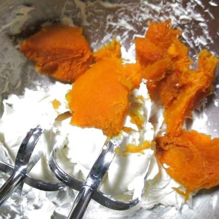 ステップ①:ボウルに、クリームチーズを入れ、ハンドミキサーで混ぜます、1のかぼちゃを加え、混ぜ合わせます続いて、砂糖を加え混ぜ、同じように、溶き卵、生クリームも加え混ぜます