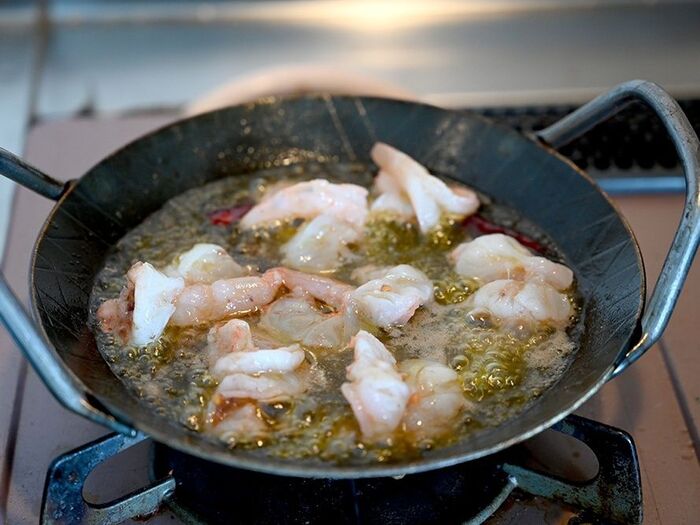 1:スキレット又はこぶりのフライパンにAを入れ中火にかけ、香りがたってきたらえびを加える。