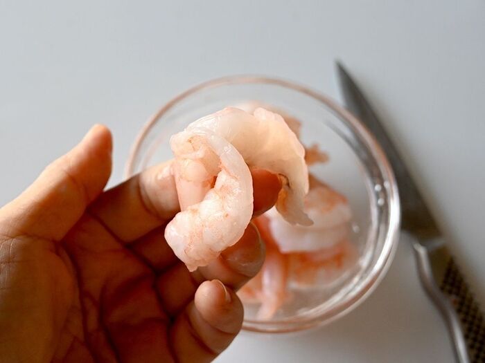 えびは背ワタをとり、しっぽ部分を少し残して半分に切り込みをいれる。