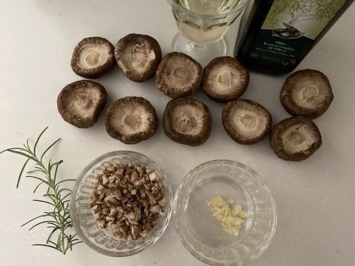 椎茸は軸を取りみじん切りに ニンニクもみじん切りにする