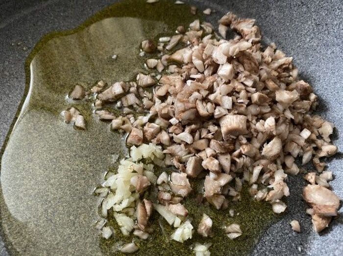 フライパンにオリーブオイルを入れみじん切りのにんにくとしいたけの軸を加え