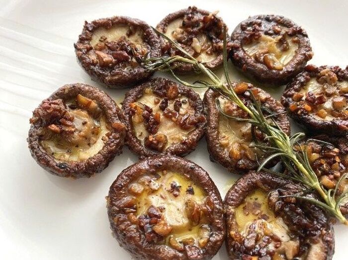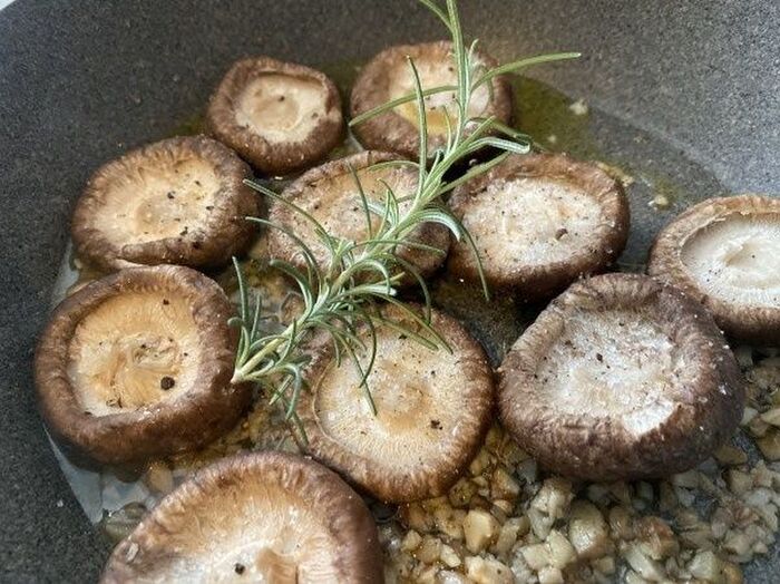 蓋を取り椎茸をひっくり返して少し強火にして水分を飛ばして 器に盛り付ける