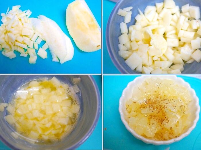 ①リンゴの皮を剥き、薄切りしたあと細かく切る。(5ミリくらい)