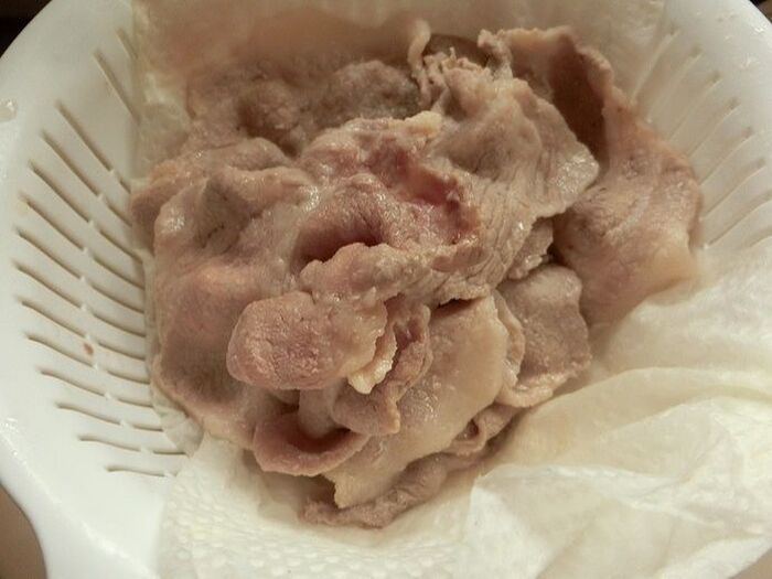 豚肉は熱湯で茹で、ザルにあげてしっかり水を切ります。