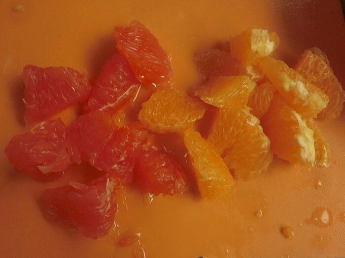 オレンジとグレープフルーツは皮をむいて半分に切ります。