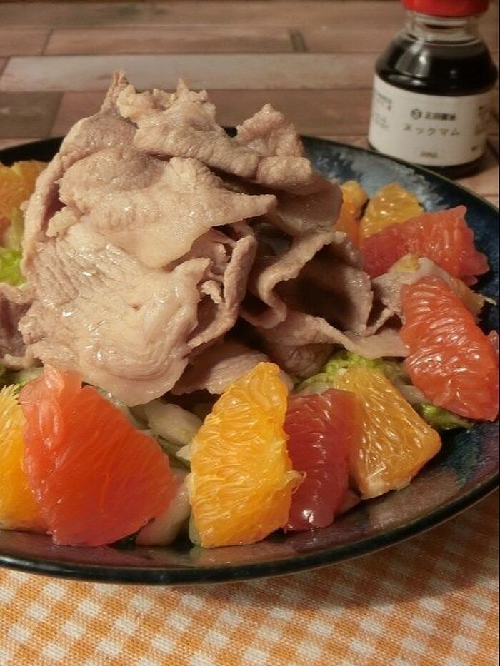 器に白菜、オレンジ、グレープフルーツ、豚肉を盛り付けて完成♪