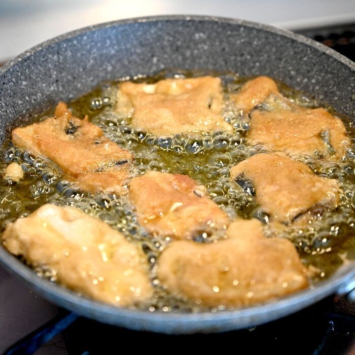 3:さんまが2/3つかる程度の油を熱し(米油お勧め!)、2をカリッと香ばしく揚げる。