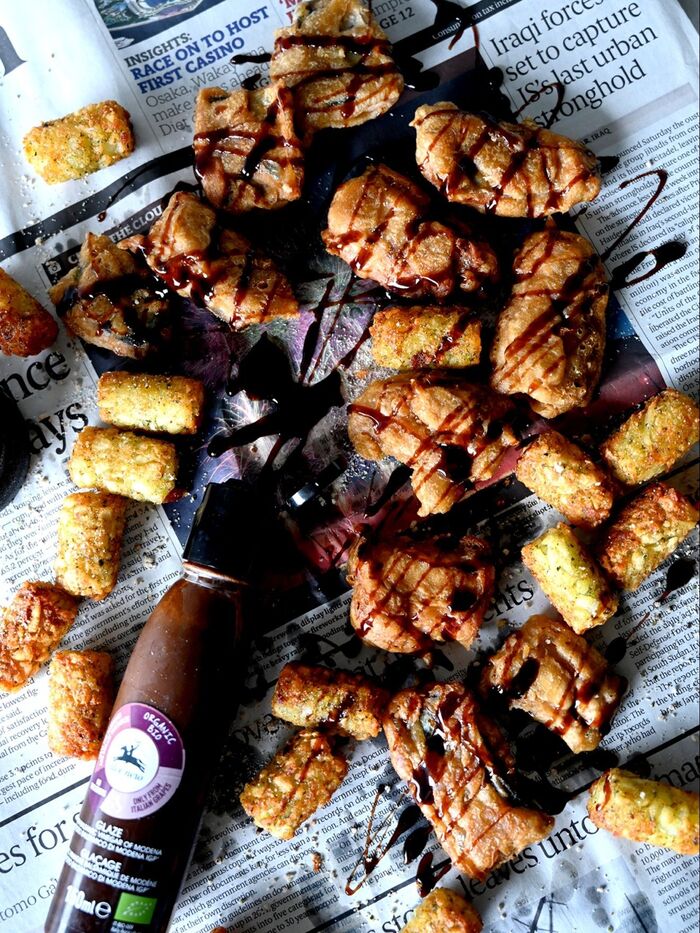 4:あつあつのうちに少しの振り塩をして、バルサミコビネガー又はバルサミコクリームをお好み量かける(たっぷりとがお勧め)。