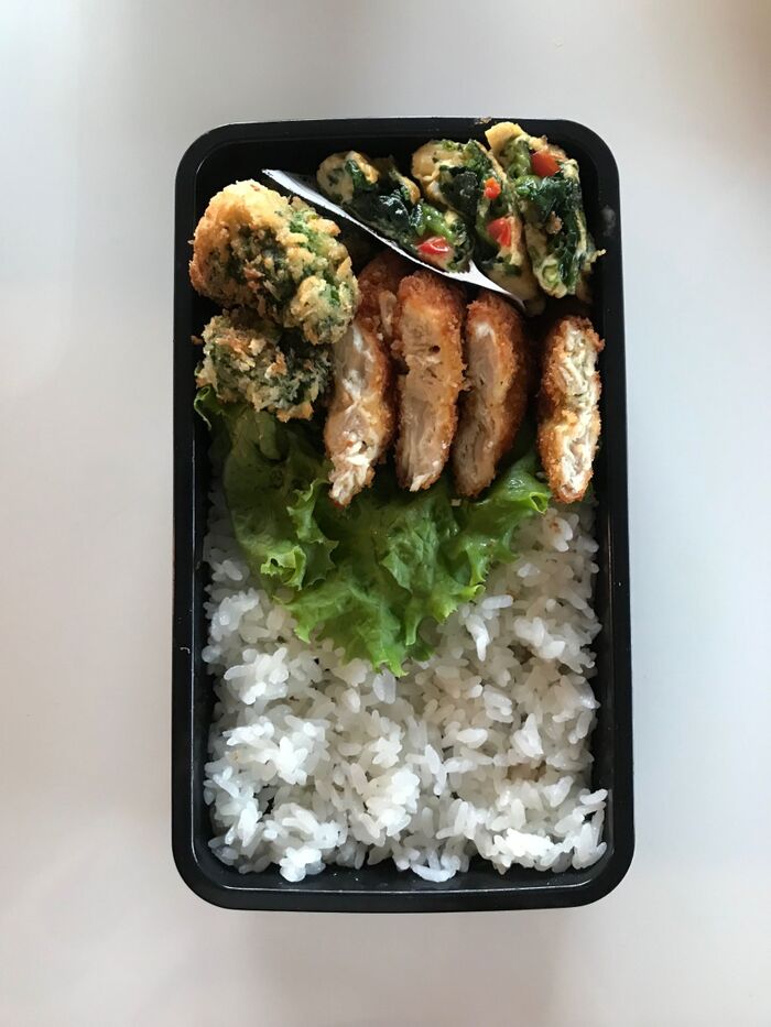 オムレツは、ほうれん草、パプリカ、コーンをプラス!ケチャップも容器を可愛く❣️