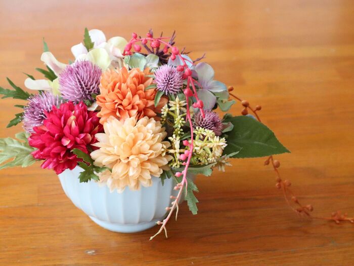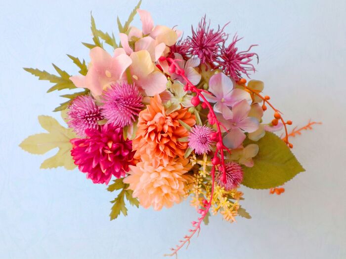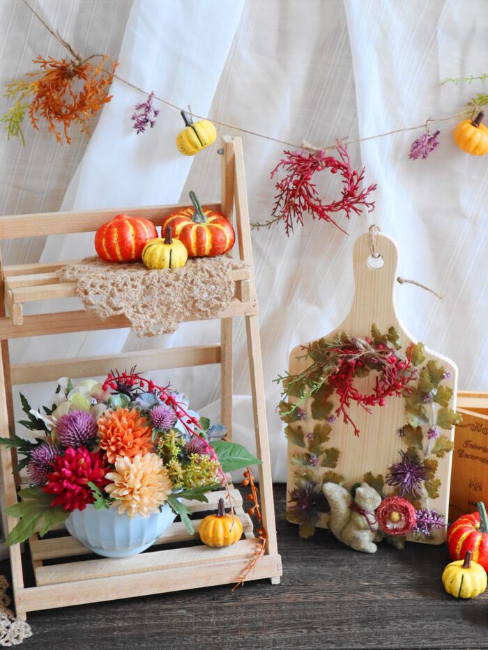 いかにも秋といったモミジの葉の造花もありますが、