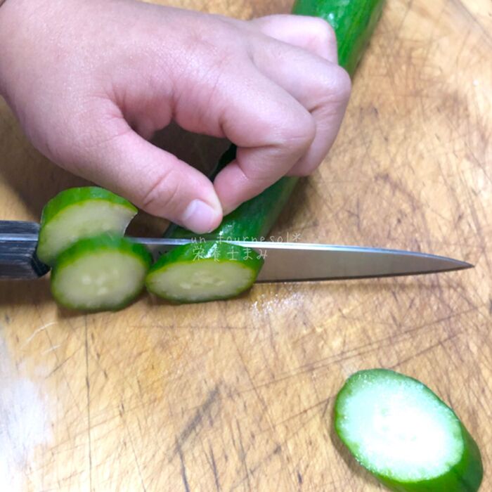 キャベツとトマト・ハムは角切り、にんじんはいちょう切り、きゅうりはななめ切り、とうもろこしは600W3〜4分加熱して包丁で粒を切り、昆布は1cm幅にハサミで切る。