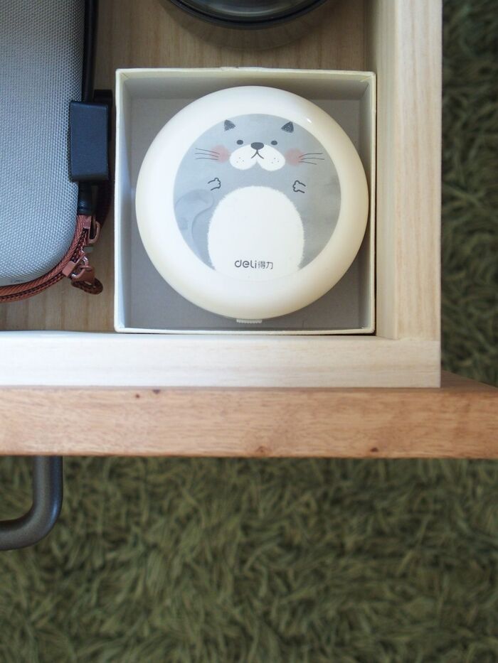 学習机の引き出しの中に入れています。(先ほどのデザインの卓上掃除機は私用になりました。笑)