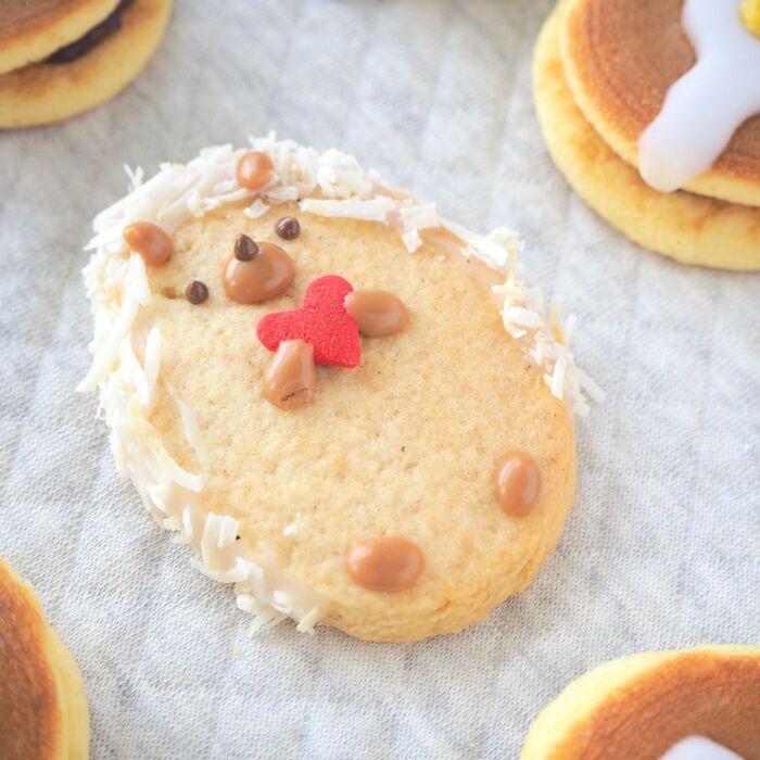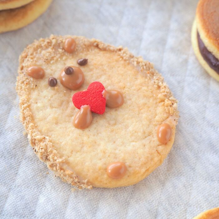 6:湯煎したチョコペンで目、鼻、手、足、耳をかきます。手はお腹にスプリンクルをチョコでくっつけてから描いてください。