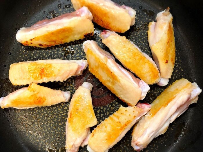 1.(油なしで)中火で熱したフライパンで、手羽を両面焼く。