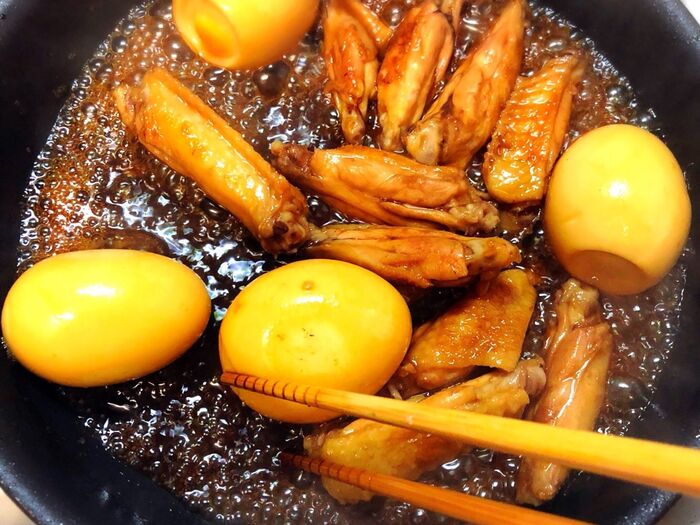 2.焼き色がついたら、●とゆで卵を加え、たまに混ぜながらとろみがつくまで8分程煮る。
