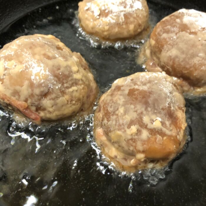 シイタケに豚肉を詰め、全体に片栗粉をまぶし、油を入れたフライパンで、じっくり両面揚げ焼きにすれば完成‼︎《中火〜弱火》